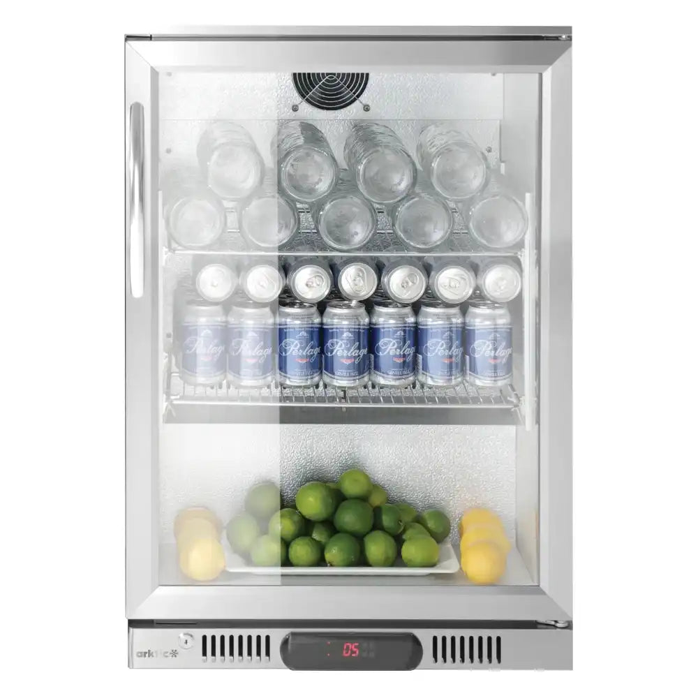 Den självstängande glasdörren gör att du snabbt ser vad som finns i kylen utan att behöva öppna den. Inuti lyser LED-belysningen upp hela skåpet, så att flaskor och burkar alltid är tydligt synliga, även i mörkare miljöer. Den ljusa aluminiuminsidan gör det lätt att hålla ordning och ger ett fräscht intryck. Utsidan i silverfärgat stål passar in i de flesta serveringsmiljöer.
