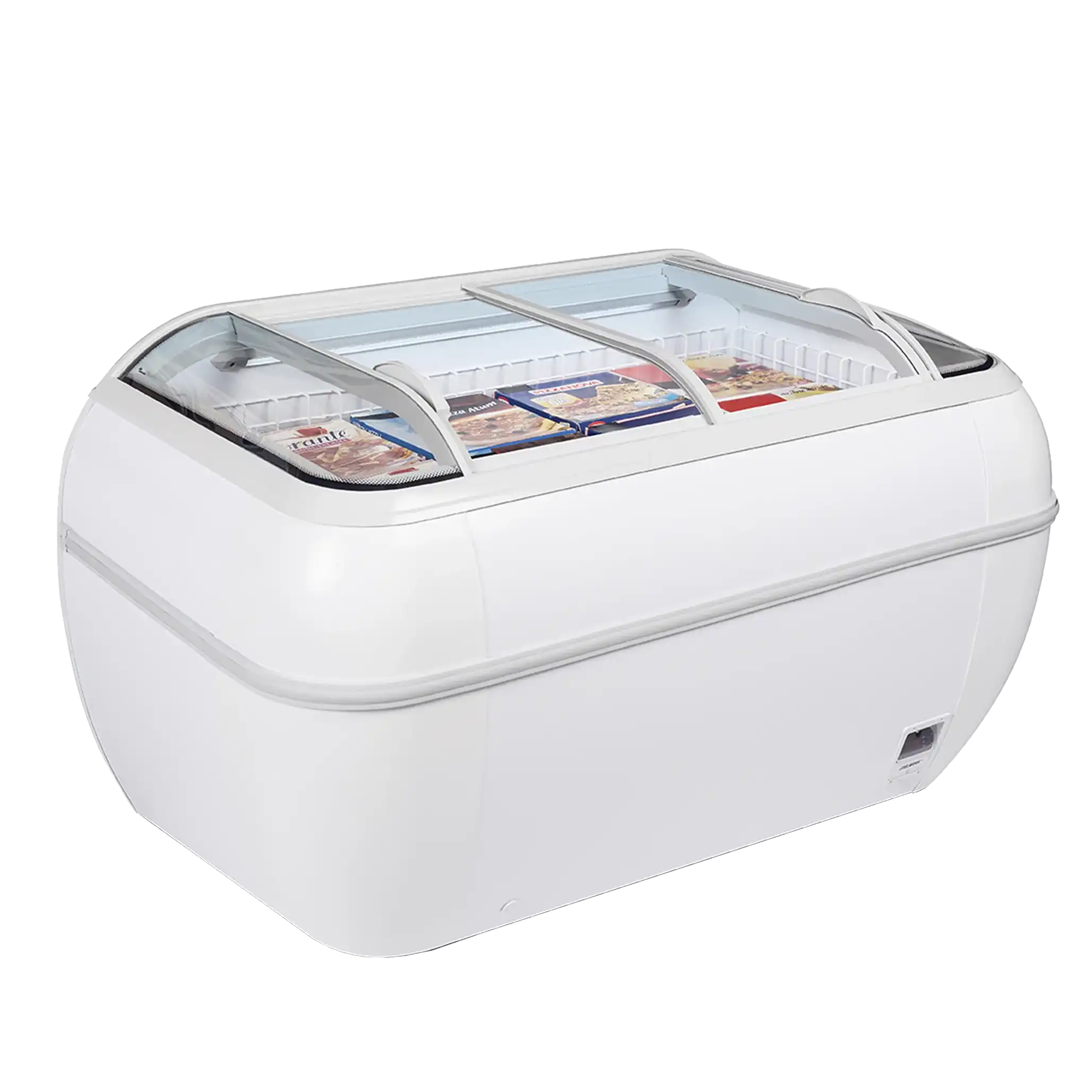 LED-belysningen lyser upp hela insidan och gör sortimentet lätt att överblicka. De välvda glaslocken ger tydlig insyn så att varorna syns direkt. Frysboxen har en tålig, pulverlackerad insida som är enkel att hålla ren. Tre medföljande avdelare gör det lätt att hålla ordning på innehållet.
